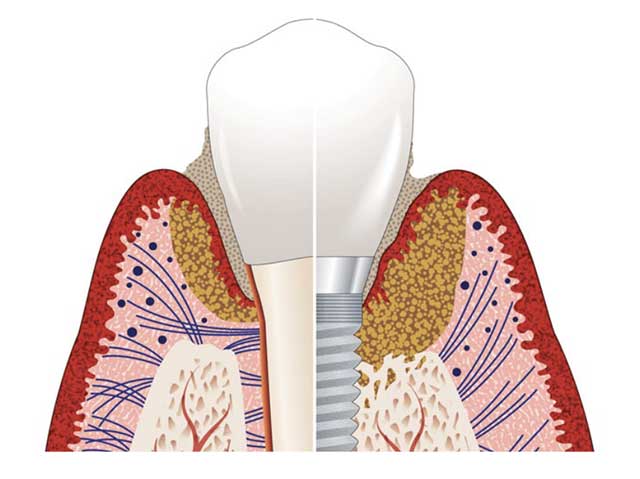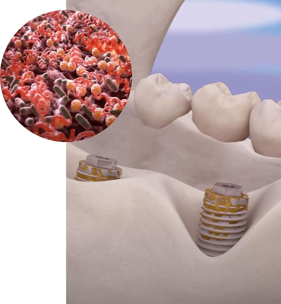 Assim como a Periodontite, o acúmulo de bactérias (biofilme) ao redor do implante leva a inicialmente um quadro clínico chamado de mucosite que é uma inflamação da gengiva ao redor do implante, que se apresenta avermelhada, com edema e sangramento. E caso não seja tratada pode evoluir para a peri-implantite onde ocorre a perda de osso ao redor do implante, podendo estar associada a sangramento e presença de pus. Podendo levar a perda do implante.